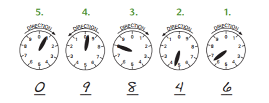 - The pointer on the fourth dial is very close to 0 but is still between 9 and 0. Remember that 0 represents 10, so the lower number is 9.