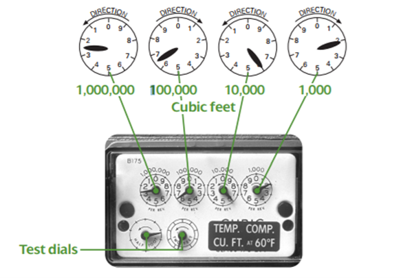On a natural gas meter, the dials represent the amount of natural gas measured in volumes of hundreds of cubic feet (ccf), the lower amounts are to the right. The natural gas meter has either four or five dials, and one or two test dials that you may ignore.