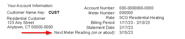 Your prior gas bill shows the next scheduled meter read date in Your Account Information: